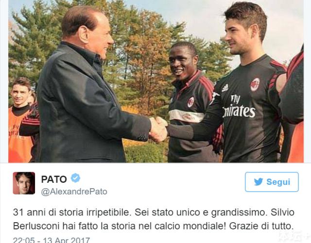 如今效力天津权健的帕托也在中国发表了他的感受(上图),“31年的历史不可重复,你是唯一,也是最伟大的人,西尔维奥·贝卢斯科尼,你创造了世界足球的历史,感谢你所做的一切。”