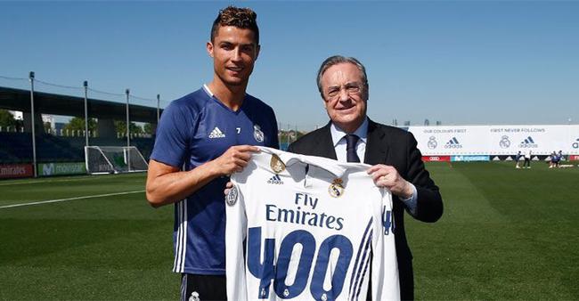 在赛后的调整训练前,皇马主席弗洛伦蒂诺向C罗赠送了400球纪念球衣,葡萄牙人也非常开心。