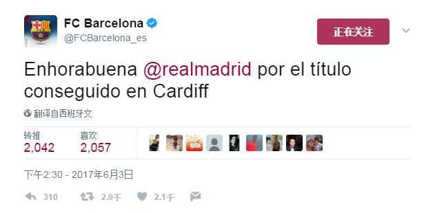 比赛结束之后,巴萨很快就给出了反应,他们在官方推特上祝贺皇马:“恭喜皇马在卡迪夫赢下冠军。”