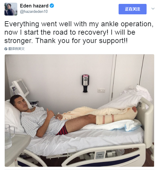 阿扎尔感谢球迷支持 在今天凌晨,阿扎尔接受了脚踝手术,手术进行的非常顺利。此后阿扎尔在个人推特上传了脚踝手术完成后的照片,并表示“我的脚踝手术成功了,现在我将开始进行恢复,我会变得更强,感谢所有人对我的支持!”