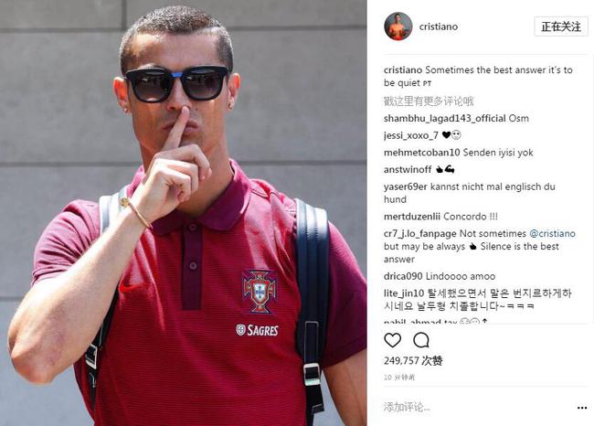 葡萄牙球星C罗在个人INS上晒出了一张照片,并且写到:有时候最好的回应就是保持沉默。