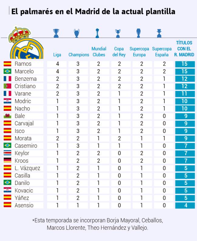 在皇马阵中,马塞洛的皇马冠军数与拉莫斯一样,都是15个。C罗跟本泽马并列,他们一同为皇马赢得了12个冠军。年轻的法国中卫瓦拉内,赢得了11个冠军,排名第五名。莫德里奇与纳乔,两人都跟随皇马赢得了10个冠军。
